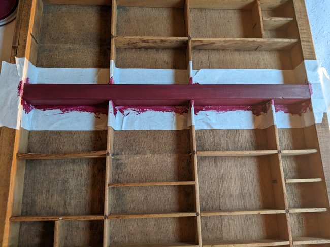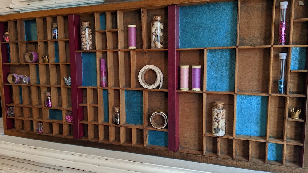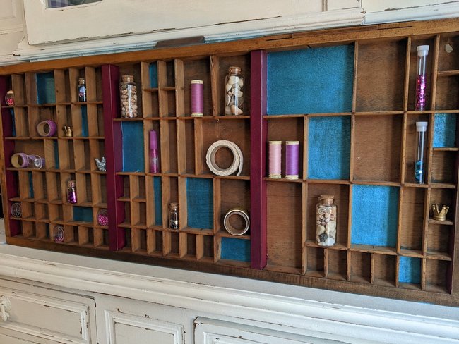 Vor allem Setzkästen mit vielen kleinen Fächern eignen sich als Bastelregal. Alte Druckerschubladen beispielsweise, die ihr auch oft in Läden mit Vintage-Deko kaufen könnt. Ich hatte noch einen aus meiner Kindheit, den ich schon lange etwas aufpeppen wollte.