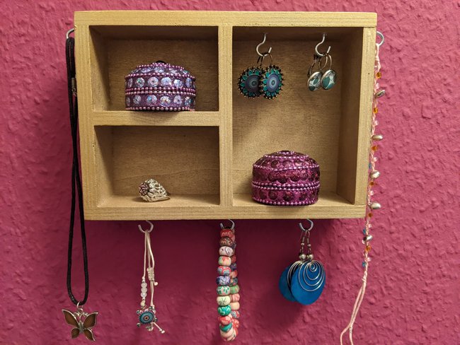 - Dann macht ihr überall dort kleine Schraubhaken ran, wo ihr Schmuck hinhängen wollte. In kleine Fächer am besten oben einen einzelnen Haken und in größere zwei. Außen seitlich oben einen Haken und unten einfach mehrere aneinanderreihen.