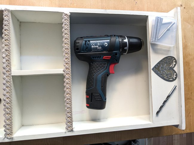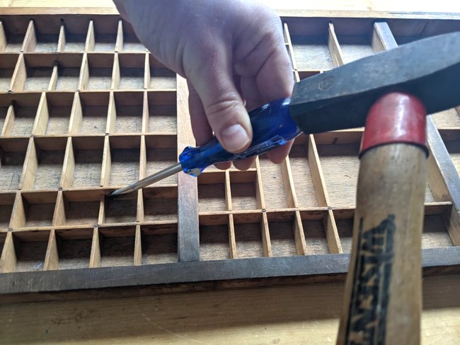 - Zuerst müsst ihr das Vintage-Stück etwas aufarbeiten. Oft sind einige der dünnen Hölzer gebrochen, das macht aber nichts. Mit Schlitzschraubenzieher und Hammer könnt ihr diese vorsichtig entfernen. Das gilt natürlich auch, falls ihr einfach ein paar Fächer vergrößern wollt.