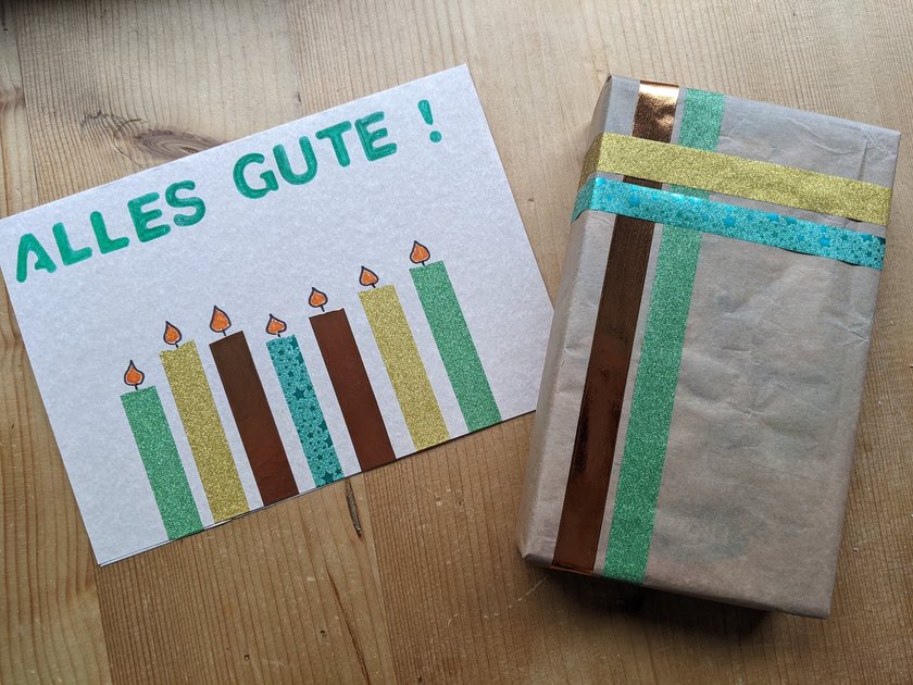 Schon aus Nachhaltigkeitsgründen gestalte ich Geschenkpapier inzwischen immer selbst. Aber es ist auch leicht gemacht – hebt einfach Packpapier immer auf, wenn es mal ins Haus flattert. Je nach Anlass könnt ihr dann das geeignete Tape für die Gestaltung auswählen. Zu Weihnachten klebt ihr beispielsweise einen Tannenbaum. Zum Geburtstag sind Kerzen ideal. Nutzt für Karte und Verpackung am besten das gleiche Design, das wirkt besonders harmonisch.