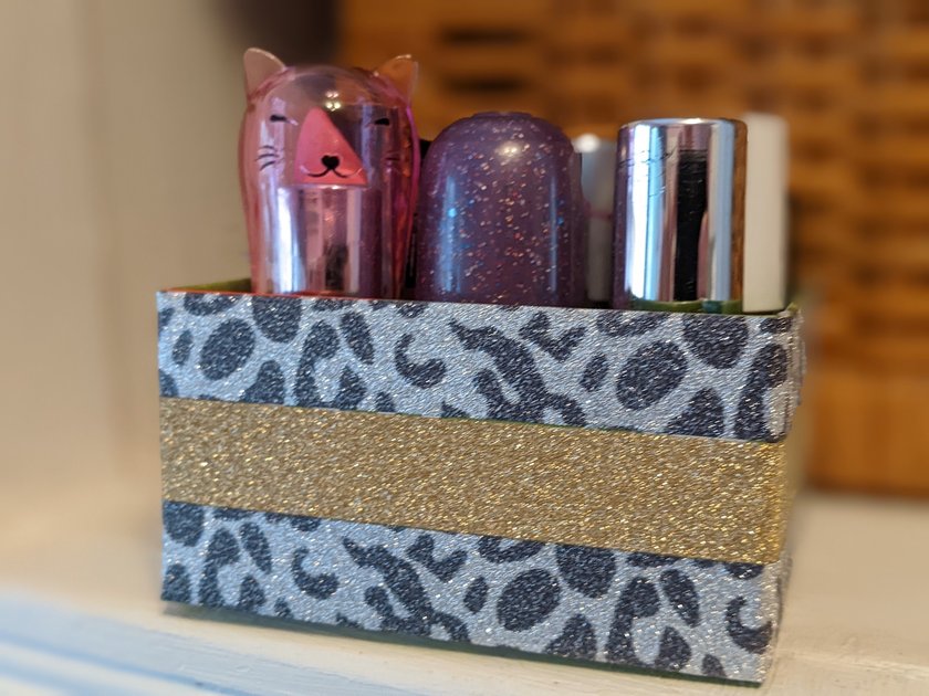 Ebenso wie Gläser können auch alte Schachteln zu schmucken Behältern zur Aufbewahrung werden. Anders als bei Glas setzt ihr dann nicht nur farbige Highlights, sondern umklebt die Schachtel komplett. Mit nur drei Streifen kann aus einer Wattestäbchen-Packung ein prächtiger Nagellack-Organizer werden. Glitzertape eignet sich dafür besonders gut.