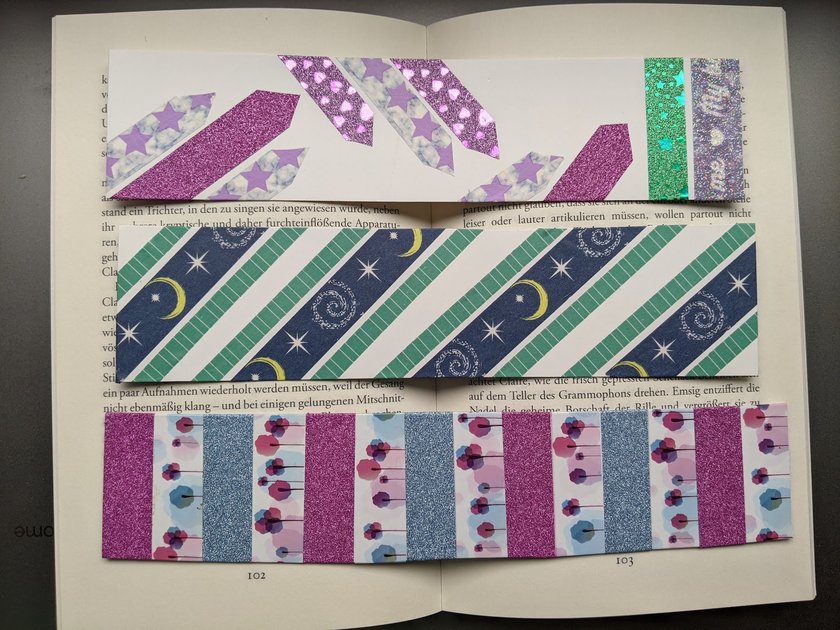 Jeder olle Streifen Pappe kann mit Washi Tape zu einem wunderschönen Lesezeichen werden. Besonders einfach ist es, wenn ihr die Pappe einfach mit Streifen umklebt. Aber ihr könnt euch auch andere Muster überlegen. Bei uns hat inzwischen jede*r einen ganzen Stapel davon und auch viele andere, denn Ideen zum Basteln von Lesezeichen gibt es reichlich.