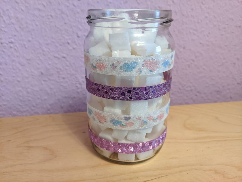 Marmeladen- und Einmachgläser eignen sich zum immer wieder Befüllen und ebenso als Dekoobjekt. Mit ein paar Bahnen Klebeband zaubert ihr im Handumdrehen einen echten Hingucker. Den könnt ihr vielfältig einsetzen – beispielsweise als Vase, Zuckerdose oder natürlich auch für Marmelade. Die Spülmaschine überlebt das Klebeband aber selbstverständlich nicht.