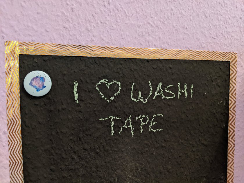 Statt einen Bilderrahmen zu verzieren, könnt ihr auch einen Rahmen direkt an die Wand kleben. Das hält auch auf Raufasertapete viel besser als man denkt. So lässt sich eine ganze Fotowand gestalten, ohne Geld für Rahmen auszugeben und ihr könnt das Design immer wieder ändern. Zudem eignet sich das Klebeband auch, um etwas ausgefranste Konturen an der Wand zu verbergen. Bei meiner magnetischen Kreidetafel habe ich das gemacht. Das Tape hält immer noch bombenfest.