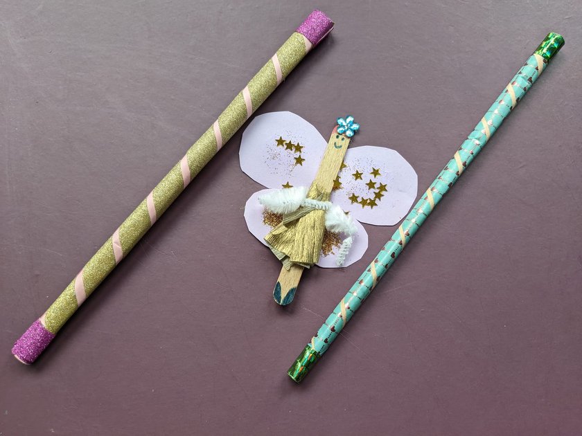 Die vielleicht schnellste Möglichkeit, um einen Zauberstab für kleine Feen und Magier zu basteln, ist die Version mit Washi Tape. Dafür rollt ihr ein Blatt Papier so eng wie möglich auf und umwickelt dieses in der gewünschten Farbe. Am besten umklebt ihr das obere und untere Ende gerade und setzt direkt darunter ein weiteres Design schräg an, das ihr dann rundherum bis unten abrollt.
