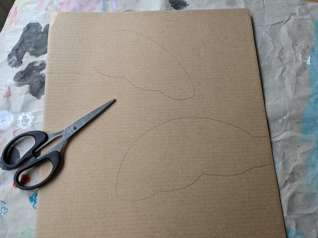 3. Zeichnet auf der Rückseite der Wellpappe die Flügel ein. Die können entweder ausgebreitet sein oder eher etwas runterhängen. Denkt auch an ein etwa 1 bis 2 cm langes Stück zum Befestigen.