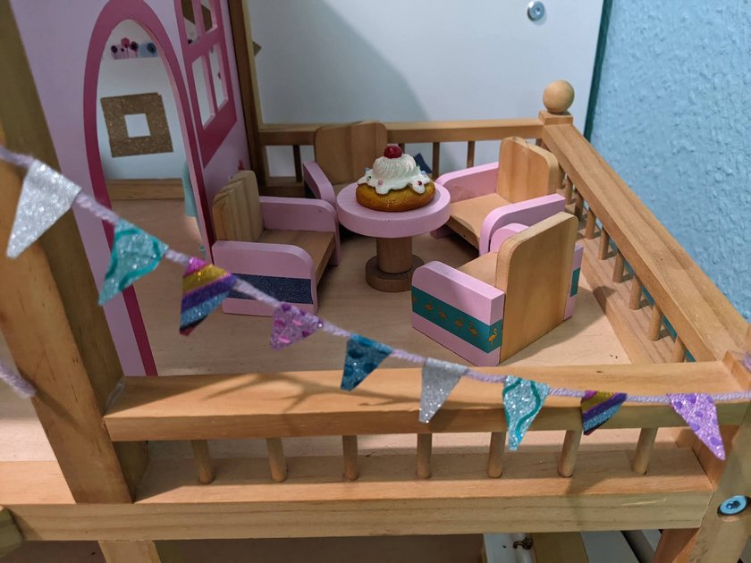 Nicht nur „echte" Möbel können ein Upcycling mit Klebeband vertragen. Auch in der Puppenstube schadet ein bisschen mehr Farbe nie. Mit ein paar Streifen buntem Klebeband werden kleine Stühle und Tische ganz leicht zum Lieblingsstück. Was nicht fehlen sollte: eine Wimpelkette! Klebt unterschiedliche Motive an einen Faden und schneidet daraus Minidreiecke.