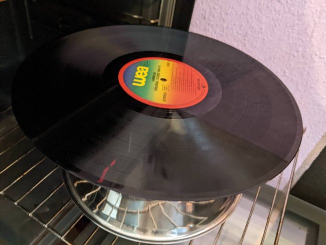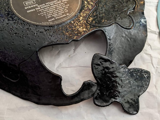 ... das ist grandios gescheitert! Der Gestank ist selbst mit Maske nicht zu ertragen und eine Platte lässt sich auch mit Hitze nicht einfach in Form schneiden. Vielleicht mit Spezialwerkzeug, das ich nicht besitze? Was aber super geht: mit einem spitzen Lötkolben-Aufsatz kleine Löcher in die Schallplatte brennen.